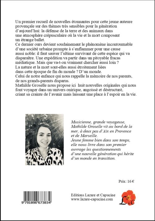 Un premier recueil de nouvelles étonnantes pour cette jeune auteure provençale sur des thèmes très sensibles pour la génération d’aujourd’hui: la défense de la terre et des animaux, dans une atmosphère crépusculaire où la vie et la mort composent un étrange ballet. Ce dernier ours devient soudainement le phénomène incontournable d’une société urbaine prompte à s’enflammer pour une cause aussi noble: il faut sauver l’ultime survivant de cette espèce qui va disparaître. Une expédition va partir dans un pitoyable fracas médiatique. Mais que va-t-on vraiment chercher aussi loin ? La nature et la mort sont-elles aussi étroitement liées dans cette époque de fin du monde ? D’un monde. Celui de notre enfance qui nous rappelle la mémoire de nos parents, de nos grands-parents disparus. Mathilde Groselle nous propose ici  huit nouvelles originales qui nous font voyager dans un univers onirique, angoissé et déstructuré, criant sa crainte de l’avenir, mais laissant une place à l’espoir en la vie.