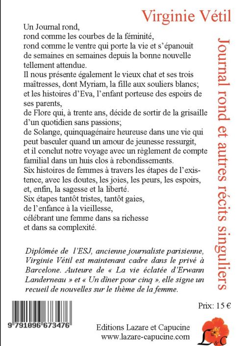 Diplômée de  l’ESJ, ancienne journaliste parisienne, Virginie Vétil est maintenant cadre dans le privé à Barcelone. Auteure de « La vie éclatée d’Erwann Landerneau » Editions LeManuscrit-2013, et « Un dîner pour cinq » Editions Lazare et Capucine,  elle signe ici un recueil de nouvelles sur la femme dans son style toujours moderne et vivant.