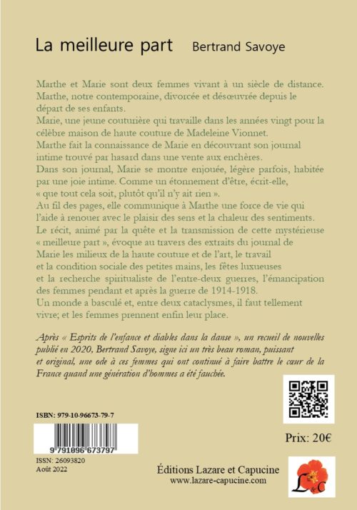 Dans son journal, Marie se montre enjouée, légère parfois, habitée par une joie intime. Comme un étonnement d’être, écrit-elle, que tout cela soit, plutôt qu’il n’y ait rien. Au fil des pages, elle communique à Marthe une force de vie qui l’aide à renouer avec le plaisir des sens et la chaleur des sentiments. Le récit, animé par la quête et la transmission de cette mystérieuse « meilleure part », évoque au travers des extraits du journal de Marie les milieux de la haute-couture et de l’art, le travail et la condition sociale des petites mains, les fêtes luxueuses et la recherche spiritualiste de l’entre-deux guerres, l’émancipation des femmes pendant et après la guerre de 1914-1918. Un monde a basculé et, entre deux cataclysmes, il faut tellement vivre.