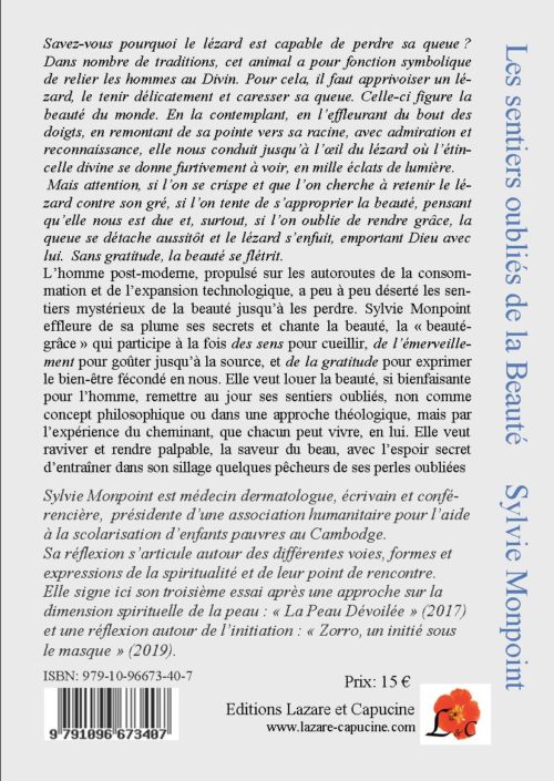 L’homme post-moderne, propulsé sur les autoroutes de la consommation et de l’expansion technologique, a peu à peu déserté les sentiers mystérieux de la beauté jusqu’à les perdre. Sylvie Monpoint effleure de sa plume ses secrets et chante la beauté, la « beauté-grâce » qui participe à la fois des sens pour cueillir, de l’émerveillement pour goûter jusqu’à la source, et de la gratitude pour exprimer le bien-être fécondé en nous. Elle veut louer la beauté, si bienfaisante pour l’homme, remettre au jour ses sentiers oubliés, non comme concept philosophique ou dans une approche théologique, mais par l’expérience du cheminant, que chacun peut vivre, en lui. Elle veut raviver et rendre palpable la saveur du beau, avec l’espoir secret d’entraîner dans son sillage quelques pêcheurs de ses perles oubliées.