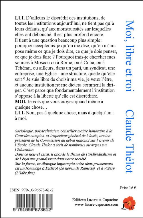 Dans ce nouvel essai, il aborde le thème de l’individualisme et de l’égoïsme grandissant dans notre société. Sur la forme, ce dialogue impromptu entre deux promeneurs est un hommage à Diderot (Le neveu de Rameau) et à Valéry (L’Idée fixe).