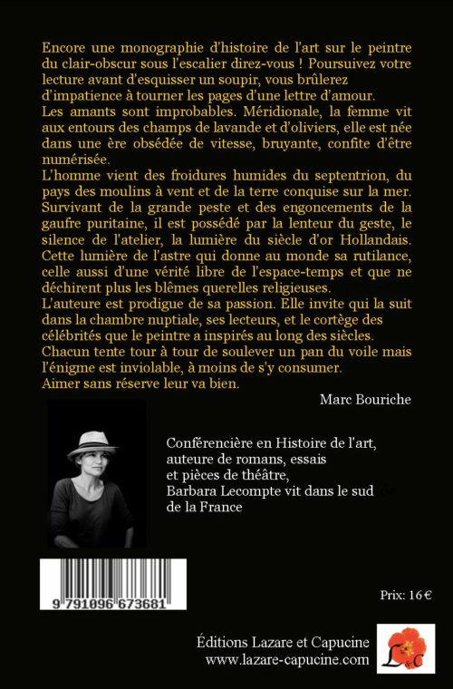 Encore une monographie d’histoire de l’art sur le peintre du clair-obscur sous l’escalier direz-vous ! Poursuivez votre lecture avant d’esquisser un soupir, vous brûlerez d’impatience à tourner les pages d’une lettre d’amour. Les amants sont improbables. Méridionale, la femme vit aux entours des champs de lavande et d’oliviers, elle est née dans une ère obsédée de vitesse, bruyante, confite d’être numérisée. L’homme vient des froidures humides du septentrion, du pays des moulins à vent et de la terre conquise sur la mer. Survivant de la grande peste et des engoncements de la gaufre puritaine, il est possédé par la lenteur du geste, le silence de l’atelier, la lumière du siècle d’or Hollandais. Cette lumière de l’astre qui donne au monde sa rutilance, celle aussi d’une vérité libre de l’espace-temps et que ne déchirent plus les blêmes querelles religieuses. L’auteure est prodigue de sa passion. Elle invite qui la suit dans la chambre nuptiale, ses lecteurs, et le cortège des célébrités que le peintre a inspirés au long des siècles. Chacun tente tour à tour de soulever un pan du voile mais l’énigme est inviolable, à moins de s’y consumer. Aimer sans réserve leur va bien.
