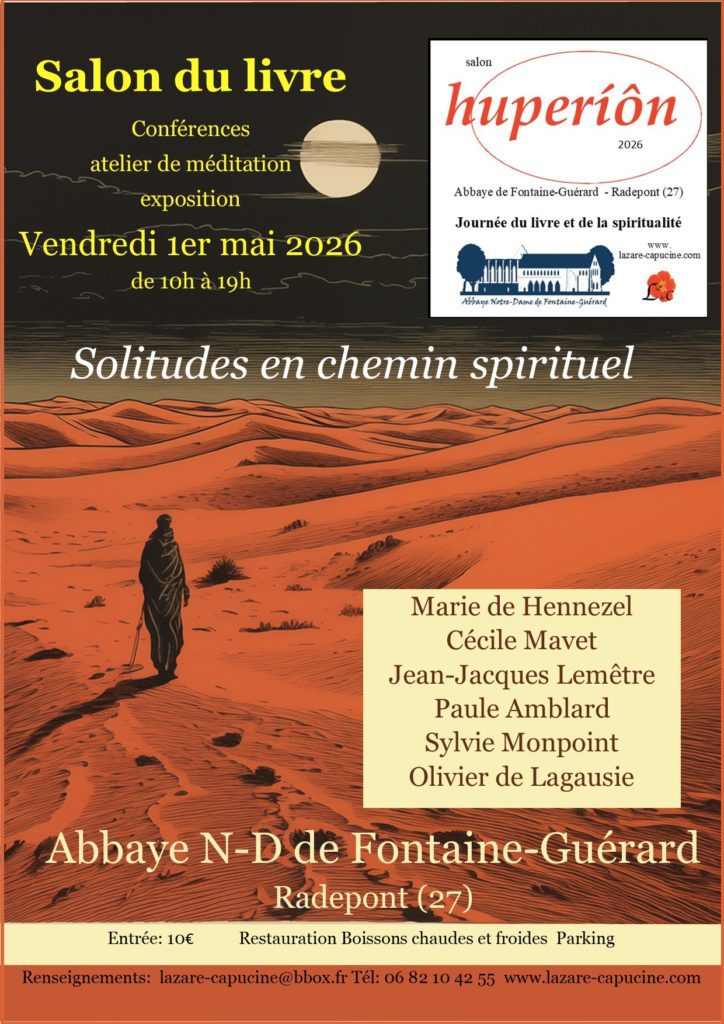Après les cinq premières éditions, l'association Huperiôn, Editions Lazare et Capucine, éditions Palamas, et l'abbaye de Fontaine-Guérard organisent la sixième édition du salon Huperiôn, journée du Livre et de la spiritualité qui se tiendra le vendredi 1er mai 2026 à l'abbaye de Fontaine-Guérard (Radepont 27).